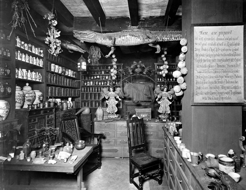 (Photo of a reconstructed 17th century English apothecary shop from the Wellcome Historical Medical Museum. 1938.)