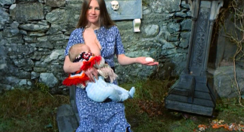 The emphasis on paganism as a fertility cult is an overriding theme of The Wicker Man, and the scene that I think best conveys the real heart of what being a “fertility cult” actually means on a level beyond bawdy songs in a pub, skyclad dancing around a Beltane fire, or making love in the grass—is the brief clip of the mother nursing her baby and holding an egg in the graveyard. The well-meaning Sergeant Howie, considering himself a devout Christian, is horrified to realize that the locals of Summerisle not only no longer consider themselves to be Christians, but actively consider themselves to be religiously Pagans, who have gone so far as to consecrate an Altar in the place where they bury their dead to honor the first fruits of the apple harvest in conscious recognition of their Old Religion. The image of the mother nursing her baby in a place devoted to the certain knowledge that everyone will die is a particularly poignant reminder of the sacredness of human fertility, yet the Sergeant, when faced with the remnants of the poor apple harvest (a sign of hardships to come), in anger makes the sign of the cross (a sign of torture and execution) from a couple pieces of a broken apple crate, while the Madonna and Child right beside him (whom he is oblivious to) slip away.