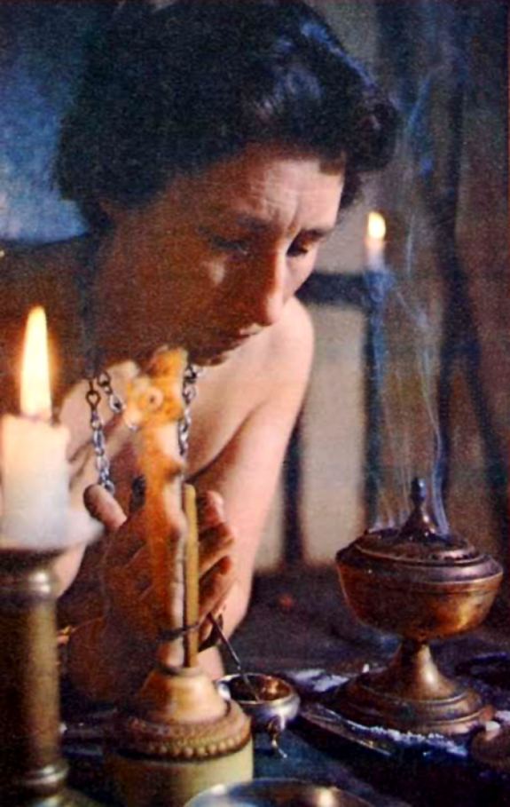 (A lovely photo of Wiccan High Priestess Eleanor Bone, or “Artemis”, consecrating the water and salt circa 1964. If any of our readers happens to know the original source of this image, please leave a comment below.)